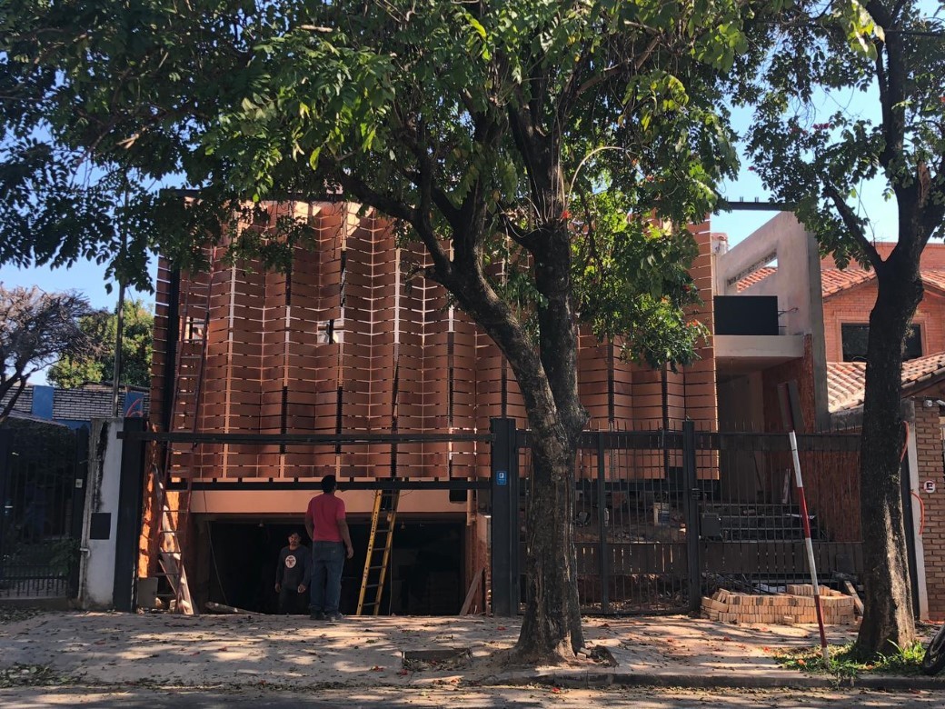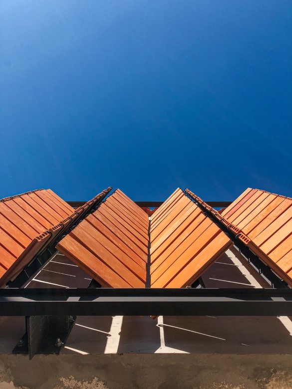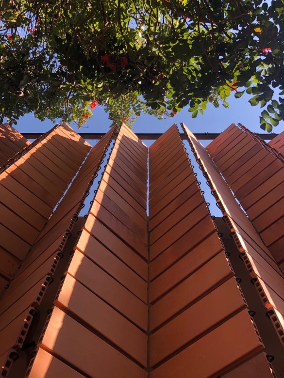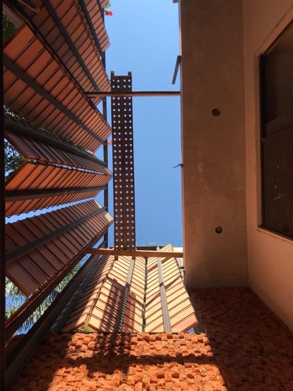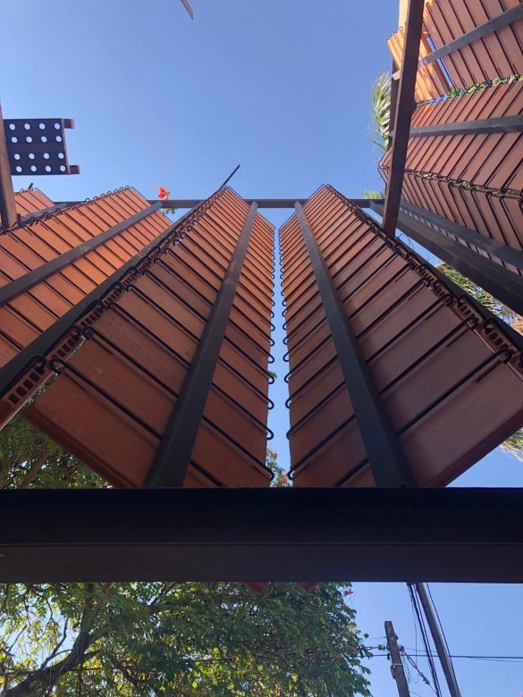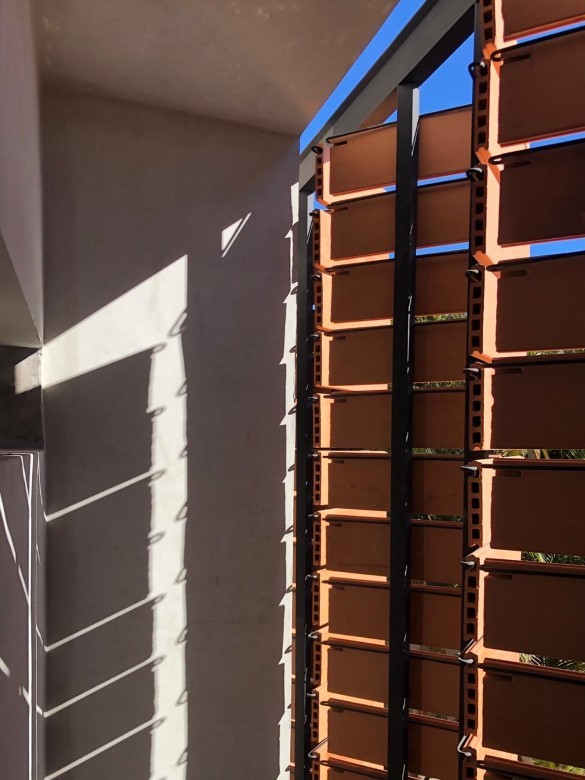 Estuvimos montando los tejuelones cerámicos en nuestros percheros metálicos hechos a medida para lograr los filtros solares de fachada principal y posterior debido a que la vivienda posee una orientación plena de Este a Oeste. Estos tejuelones reciben un corte o ranura en su cara posterior, a través de los cuales se logran colgar de la estructura principal.